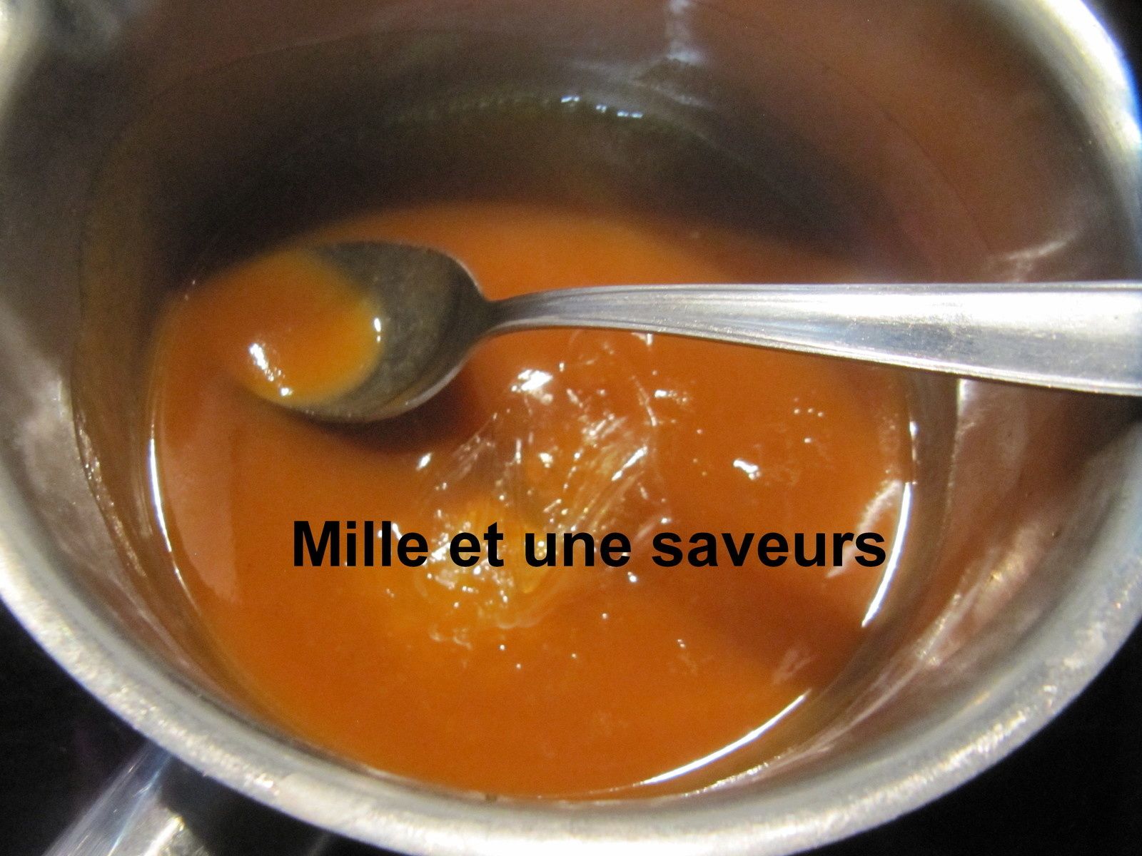 Une fois la gélatine ramollie (ce qui prend quelques minutes), éteindre le feu et déposer la gélatine préalablement essorée dans le coulis bien chaud. Mélanger le tout.