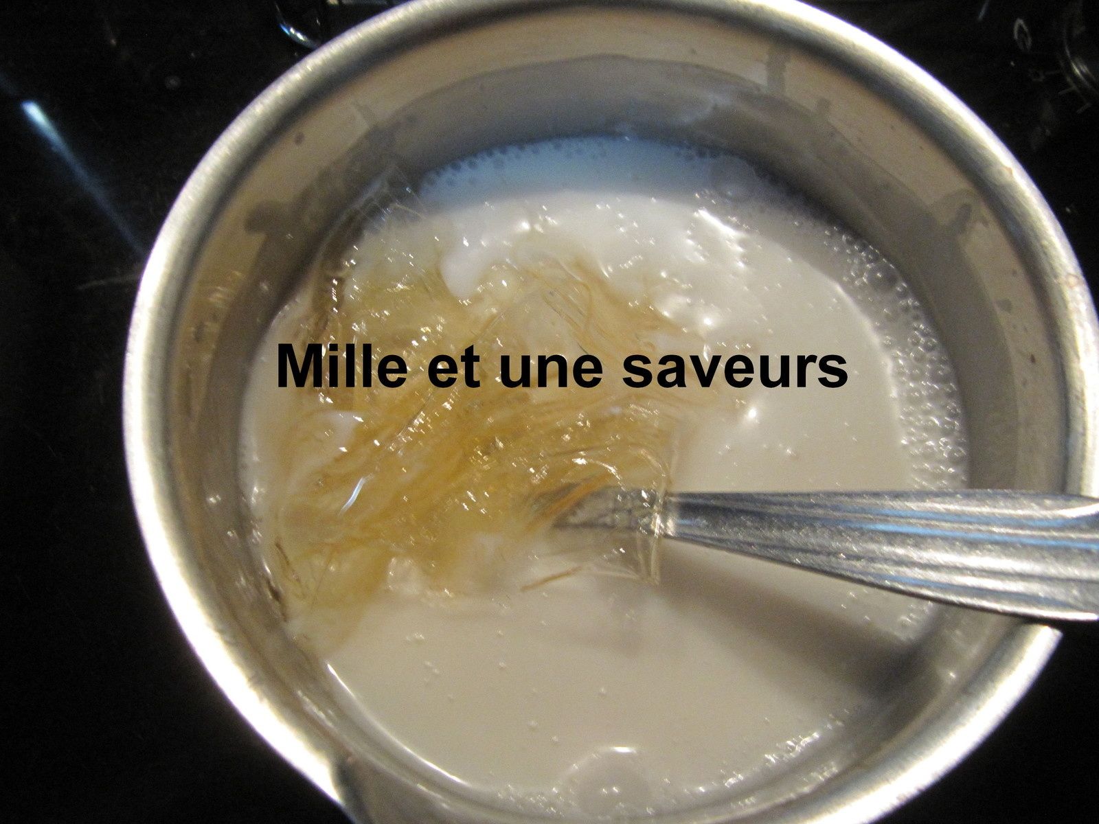 Une fois le lait de coco bien chaud, éteindre le feu et y ajouter la gélatine préalablement ramollie et essorée. Mélanger le tout.