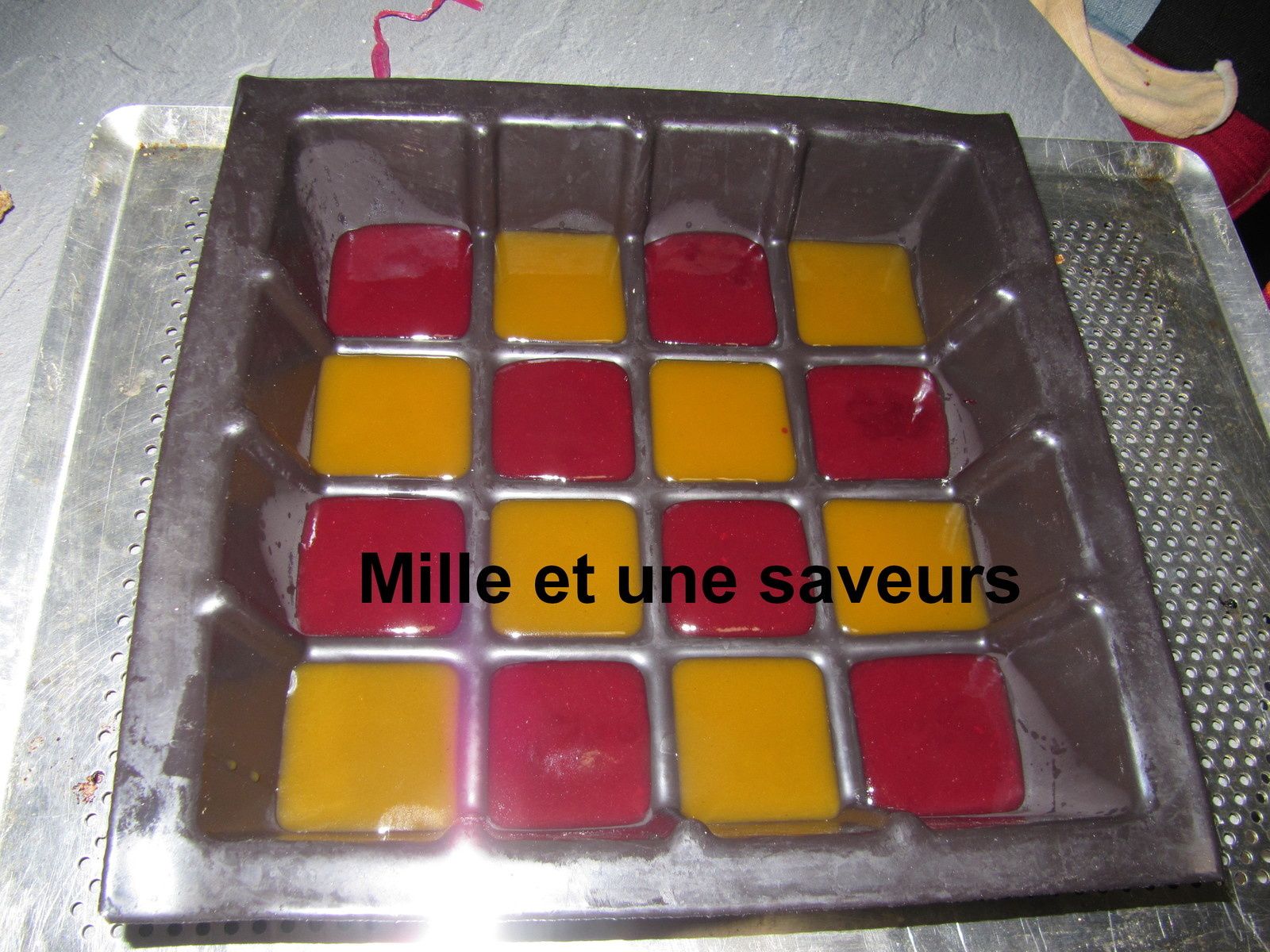 Procéder de la même manière avec le coulis de framboises et couler le coulis dans les carrés Demarle restants.